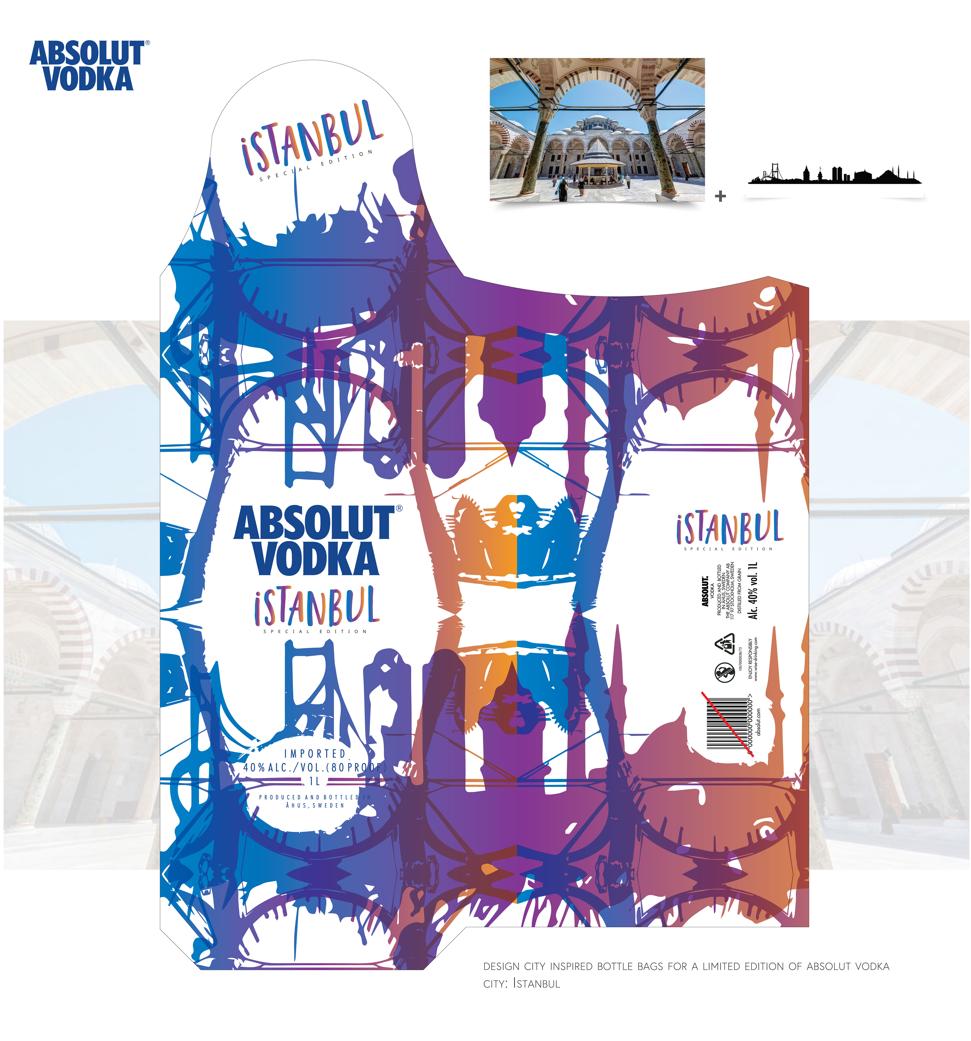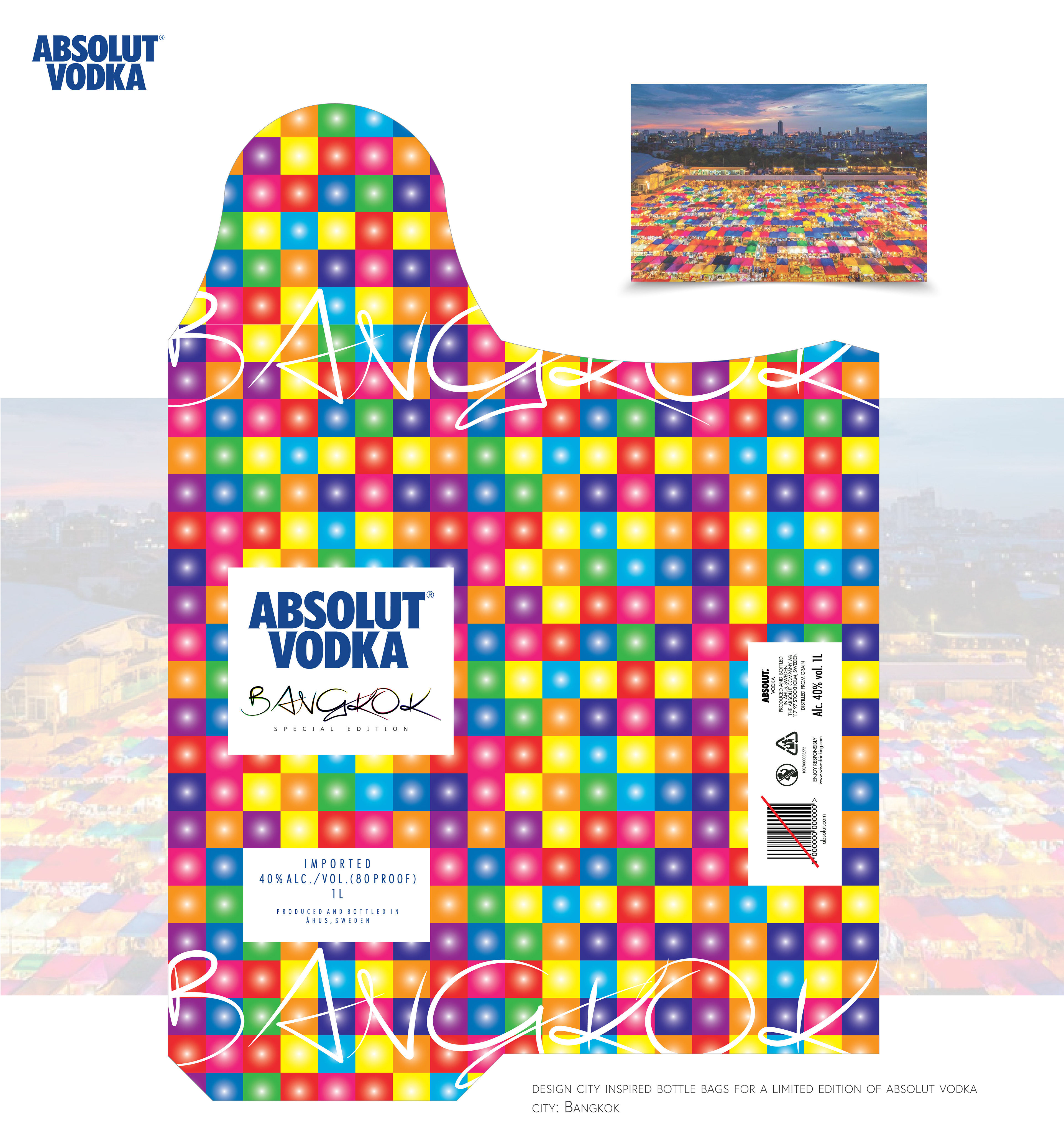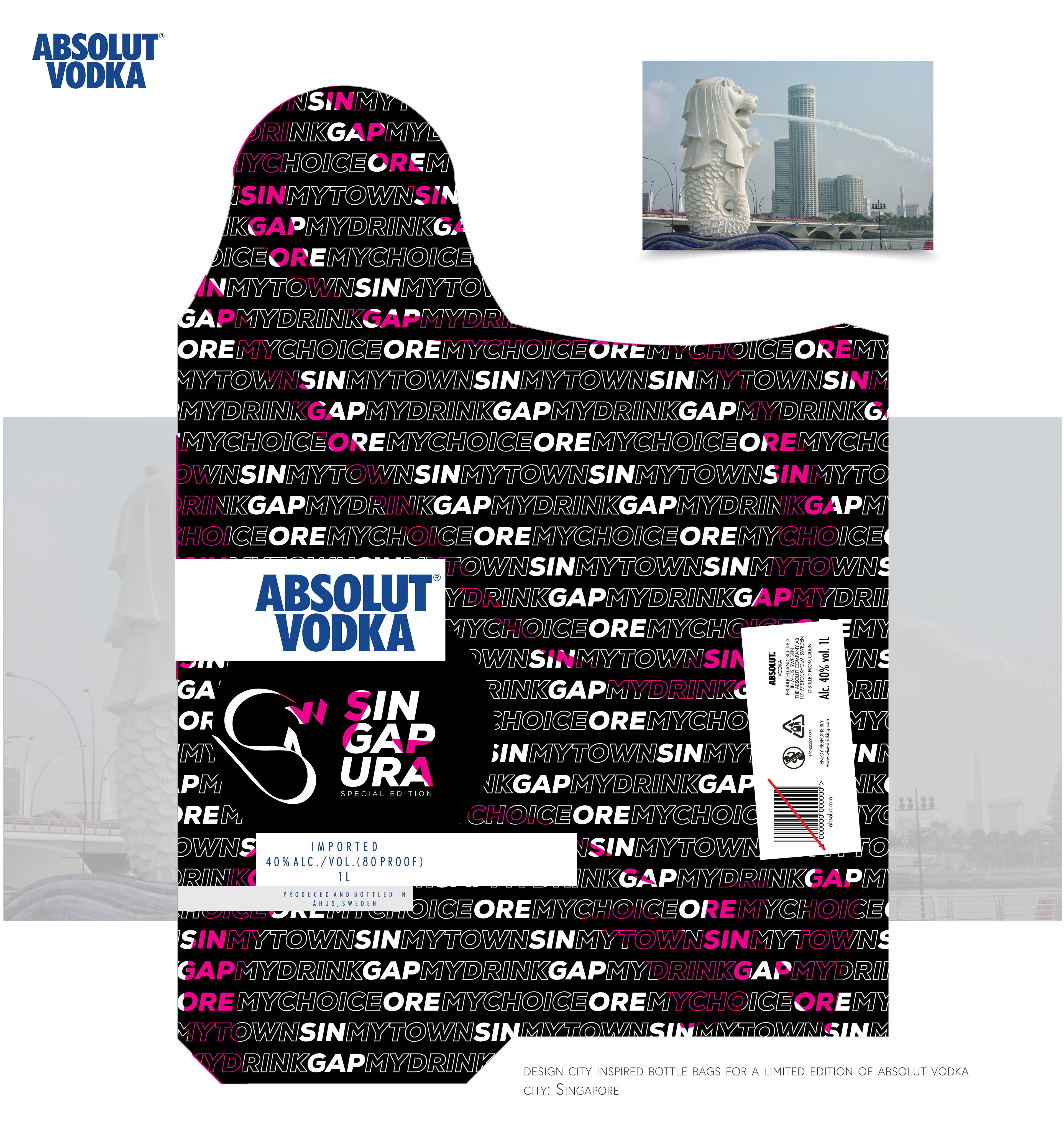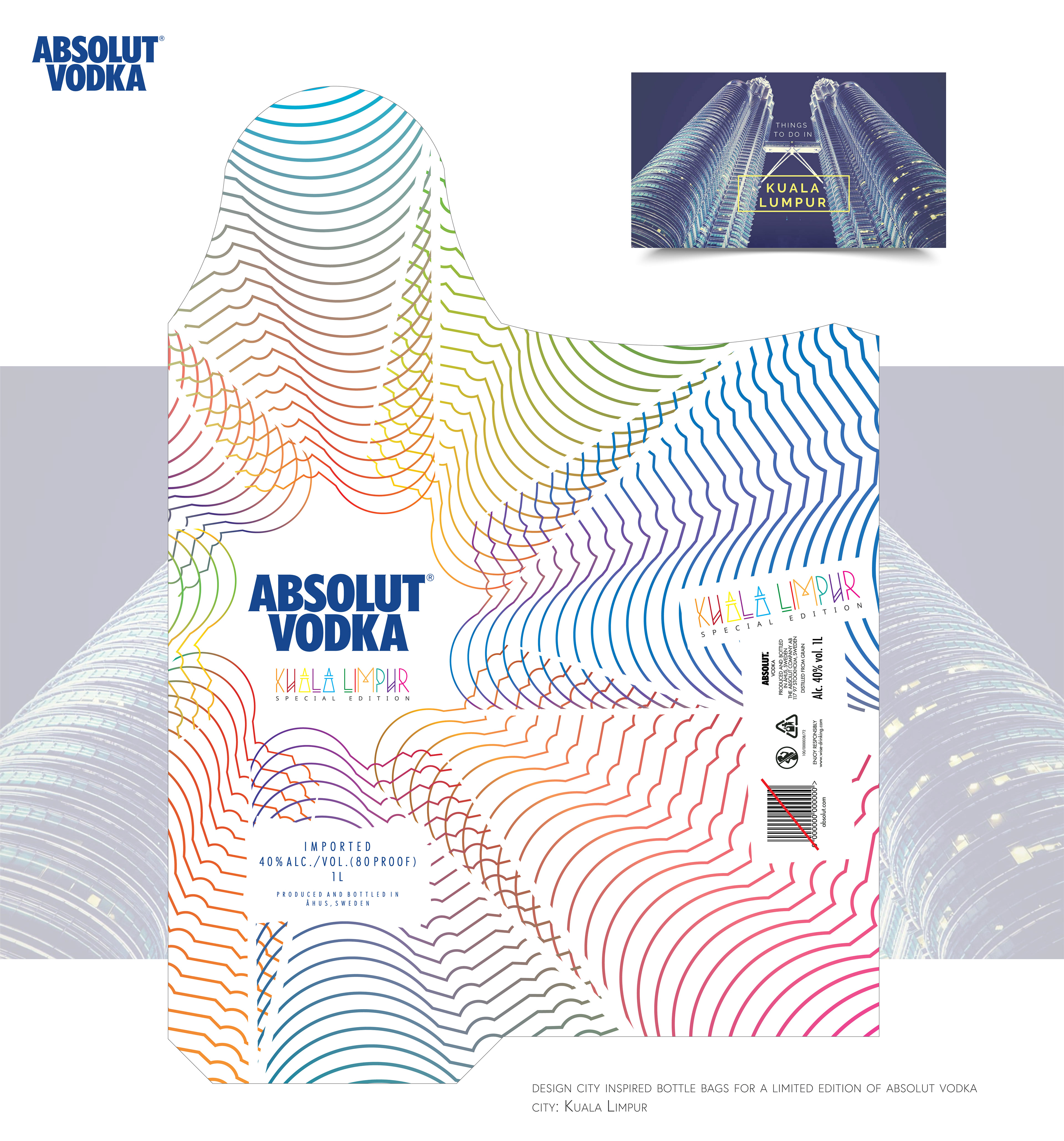 Participação em concurso para a criação gráfica de embalagem para garrafa da Absolut Vodka, inspiradas nas cidades Bangkok, Singapura, Kuala Limpur e Istanbul.